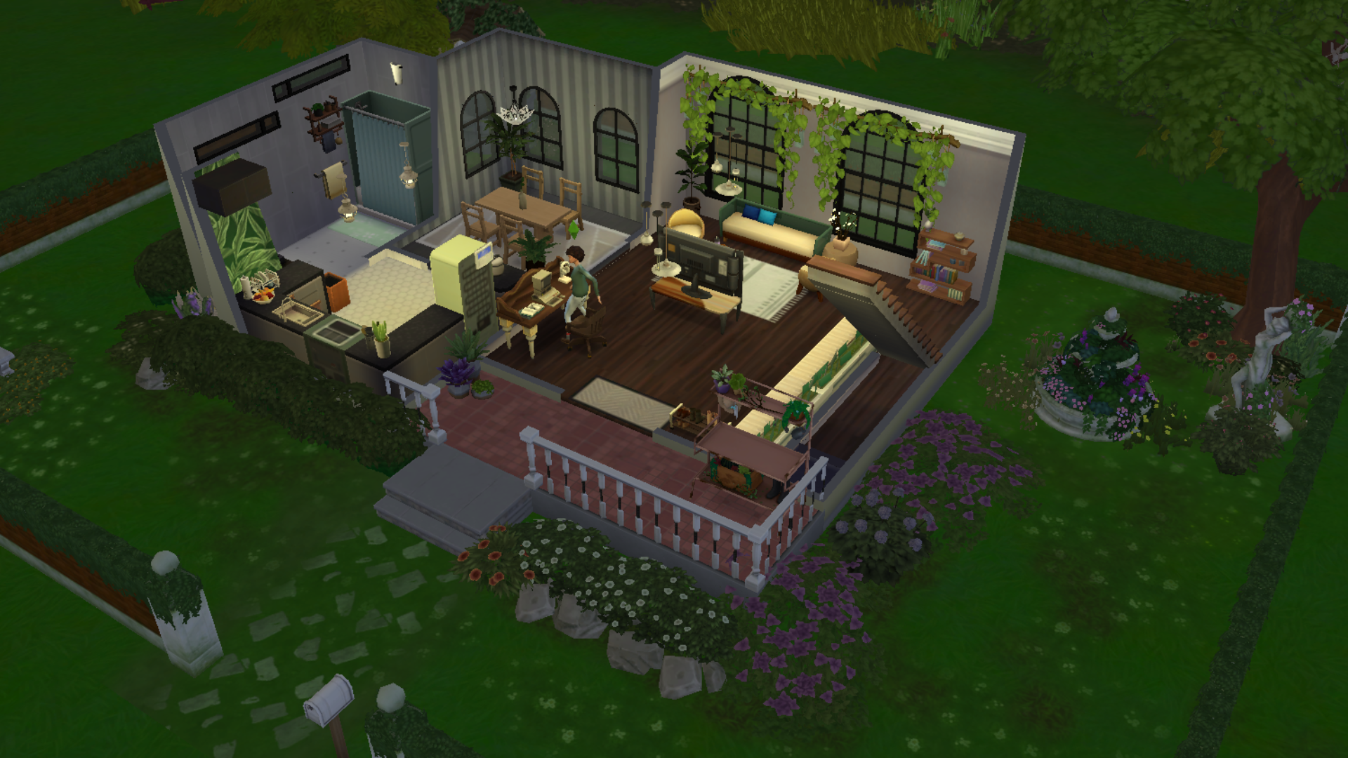 There's clutter for personality and realism, landscaping to add more depth to the lot, and an abundance of plants, leaning into the theme of a gardening family. It took me a couple of hours over the span of two days to build, decorate, landscape, and edit any blunders, but it was well worth it. My only wish is to take a screenshot of the home in better lighting, but it is what it is.