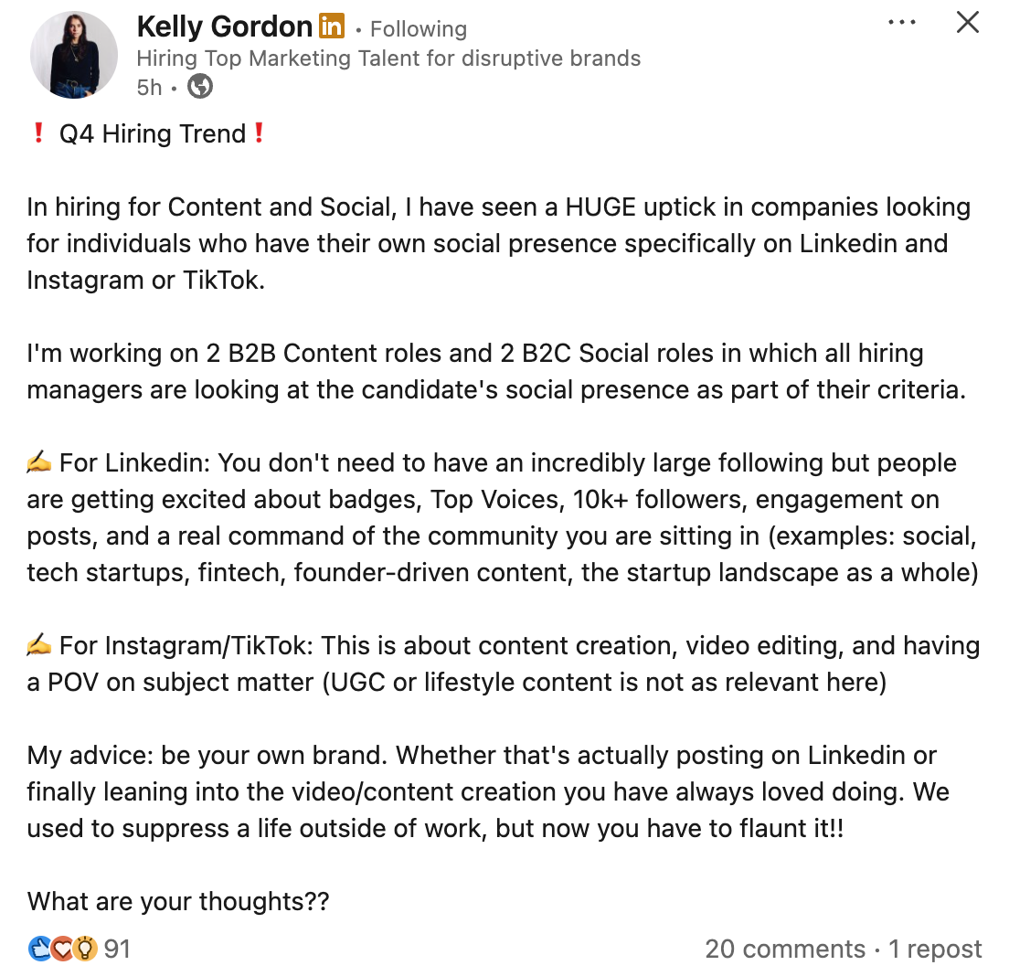 Once strictly a job-hunting platform, it now functions as an alternative Facebook where professionals share personal life anecdotes framed as career lessons. Recently, I saw a recruiter's post sharing the trend of companies prioritizing candidates who have a strong presence on LinkedIn, Instagram, or TikTok.